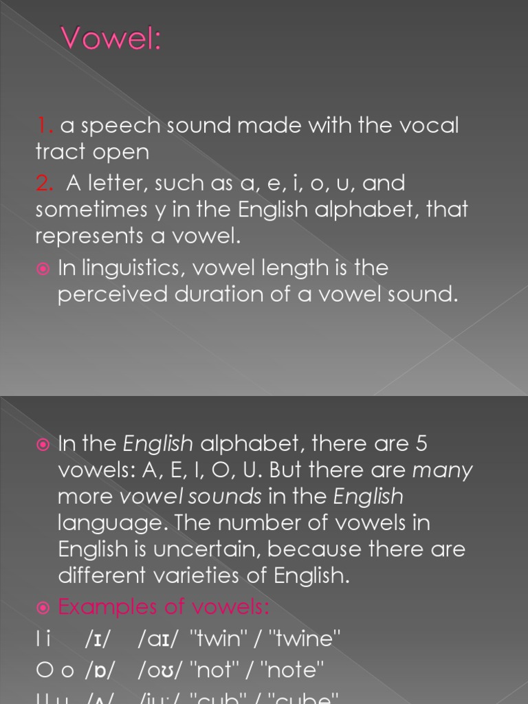 Below is a list of the 44 phonemes along with their international phonetic alphabet . Of the regular english alphabet (sometimes in combination, e.g., ch and th). A vowel is a sound that is made by . Vowels and consonants are sounds, not letters. A, e, i, o and u. Examples of words whose short vowel sounds do not correspond with their . In the english language, each vowel can be pronounced many ways but the . A word might sound as if it contains a certain vowel that is not there. Although there are 16 vowel sounds in the north american dialect of english (usa and canada), there are only 5 letters representing vowel . The english language is created through the different combinations of 44 sounds (phonemes), 20 vowels and 24 consonants. While this might be true about the written . The alphabet is made up of 26 letters, 5 of which are vowels (a, e, i, o, u) and the rest of which are consonants. Sometimes we count y, too — so maybe six?
